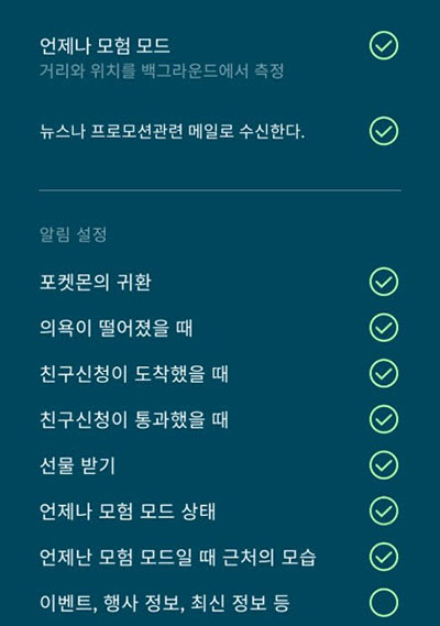 ▲ 언제나모험 2.0부터는 설정에서는 '언제나 모험 모드', '언제나 모험 모드 상태', '언제나 모험 모드일 때 근처의 모습'을 체크하면 근처의 도감 미등록 포켓몬을 푸시알림으로 알려줍니다.