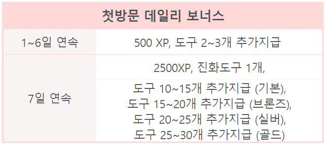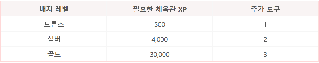 굳이 파밍 지역을 언급한 이유는 배지 등급이 올라갈 수록 체육관에서 지급하는 도구의 개수가 늘어나기 때문입니다. 브론즈의 경우 기본 지급 도구에 더해 추가 1개, 실버의 경우 추가 2개, 골드의 경우 추가 3개를 얻을 수 있습니다.
