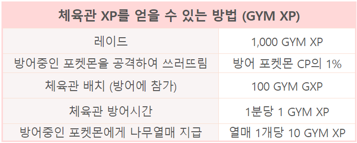 이전의 정리한 포스팅에도 언급했지만, 체육관 XP는 위의 방법으로 올릴 수 있습니다. 골드 배지까지 총 30,000 체육관 XP를 필요로 하며, 레이드 / 체육관 공격 / 체육관 방어의 방법으로 진행할 수 있습니다. (이후 체육관 XP는 GYM XP, 줄여서 GXP로 하도록 하겠습니다.)
