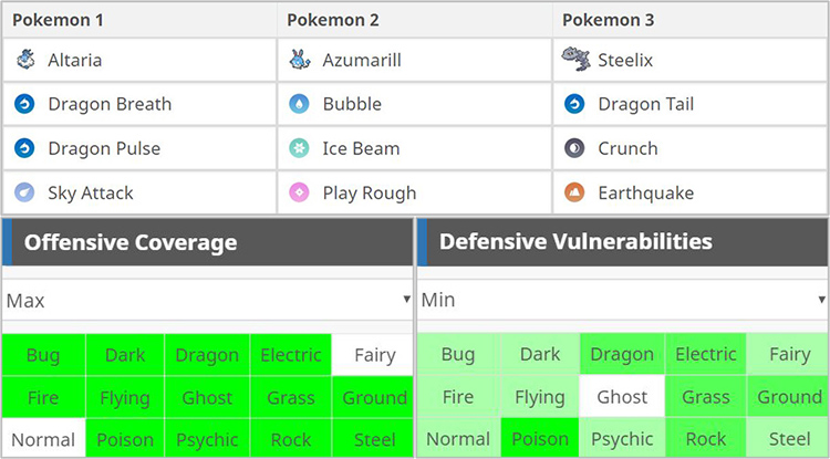 배틀파티는 3마리의 포켓몬만 선택 가능하기에 어떠한 포켓몬을 선택할 지는 매우 중요합니다. 포켓몬을 선택하는데에는 공격적인 측면과 방어적인 측면 모두 고려해야 합니다. 먼저 공격적인 측면은 포켓몬이 전체적으로 상대의 약점을 얼마나 찌를 수 있는가, 그리고 방어적인 측면은 3마리의 포켓몬이 얼마나 서로의 약점을 뒷받침해주고 전체적으로 얼마나 많은 공격 타입에 저항하는지가 중요합니다.
