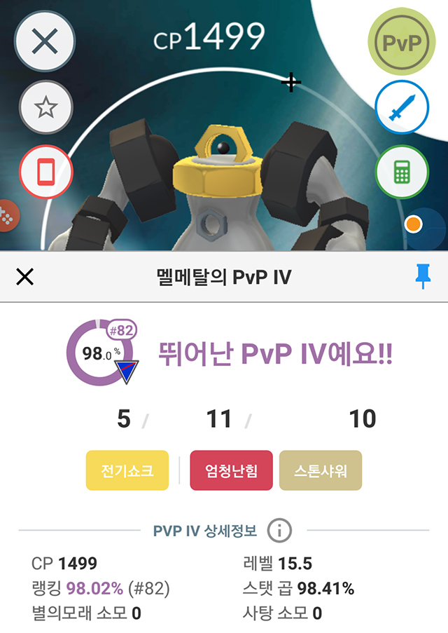 PvP IV는 애플리케이션인 PokeGenie, CalcyIV로 확인할 수 있고, 웹에서는 GoStadium을 이용하여 100%를 기준으로 몇 퍼센트 정도에 위치해 있는 지 확인할 수 있습니다. 대부분 공격 IV가 낮고 체력, 방어 IV가 높은 분포를 보이고 있으니 검사하다가 의심스러우면 남겨둔 뒤 확인하면 되겠습니다.