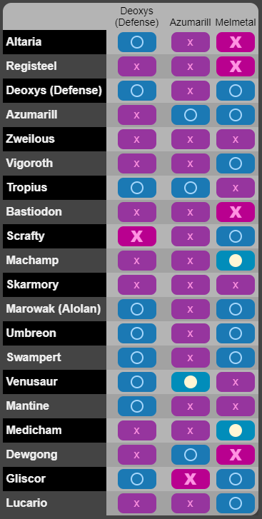 | 레지스틸의 카운터인 알로라 텅구리, 메깅, 대짱이, 요가램, 루카리오, 알로라 라이츄 등이 슈퍼리그에서 등장하게 된 원인입니다. 파비코리, 트로피우스, 무장조 등은 레지스틸 앞에서 할 수 있는 것이 없으며 대부분 교체를 강요 당합니다. 대신 레지스틸도 때로는 테오키스 디펜스폼, 메가니움, 멜메탈 등에게 취약할 수 있습니다. 록온의 모션 확인이 어렵기 때문에 러스터캐논은 6.5초, 기합구슬은 7.5초에 발동된다는 것을 숙지하면 되겠습니다. |