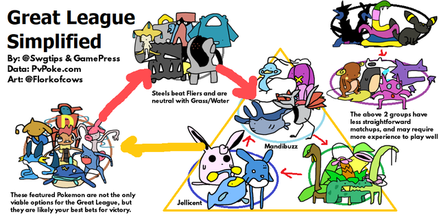 Gamepress에서 제시한 좋은 이미지 자료가 있습니다. 먼저 선발 포켓몬을 정하고, 시나리오를 짜보면서 만약 불리한 포켓몬을 만날 경우 어떤 포켓몬으로 커버할 수 있는 지, 유리한 상황을 만들어 상대방이 다른 포켓몬으로 교체할 때 다른 포켓몬을 어떤 것을 꺼낼 지 등을 생각하면서 파티를 구성하도록 합시다.