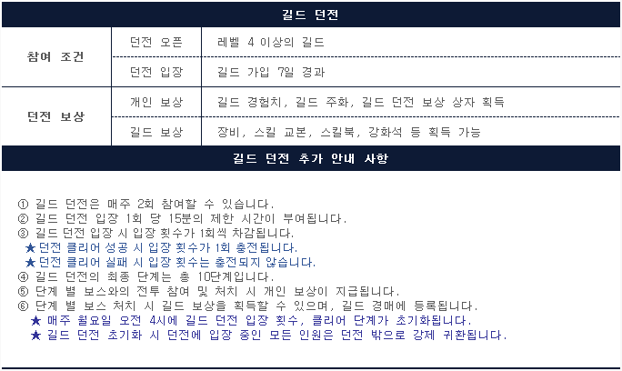 · 길드 던전에 대한 더욱 자세한 내용은 게임 가이드 [길드 던전]에서 확인하실 수 있습니다.
