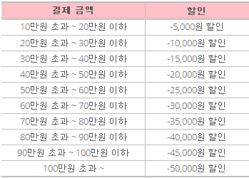 - 10만원 초과 결제 당 5천원 할인 (최대 5만원 할인)