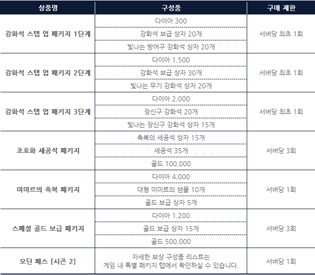 · 오딘의 축복 패키지와 스타터 스텝 업 패키지의 구성품 내 일부 텍스트 누락 현상이 수정됩니다.