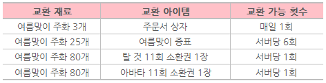 · 여름맞이 주화 보상 교환 화면에 교환 가능 횟수가 '캐릭터당'으로 표기되어 있으나, 실제로는 '서버당'인 점 참고 부탁드립니다.