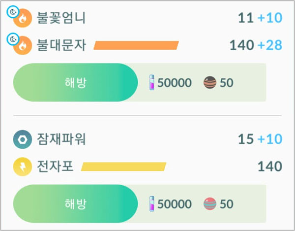 예고되었던 두번째 스페셜어택은 해방을 하여 얻을 수 있습니다. 이에는 상당량의 별의모래와 사탕이 소모되고, 랜덤의 스페셜어택을 배울 수 있습니다. 랜덤으로 배운 스페셜어택은 '스페셜 기술머신'을 사용하여 변경할 수 있습니다. 별의모래/사탕 소모의 기준은 파트너로 등록한 뒤 사탕 1개를 얻는데 필요한 거리수(Km)입니다.