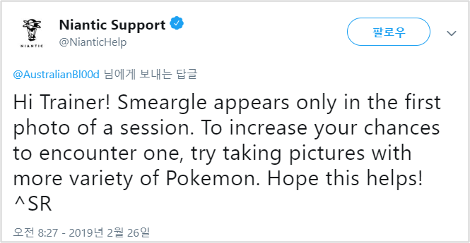 "트레이너 여러분, 안녕! 루브도는 오직 한번에 첫번째 사진에서만 등장합니다. 루브도를 만날 확률을 높이려면 다양한 포켓몬을 찍어보세요! 도움이 됐길 바랍니다!"