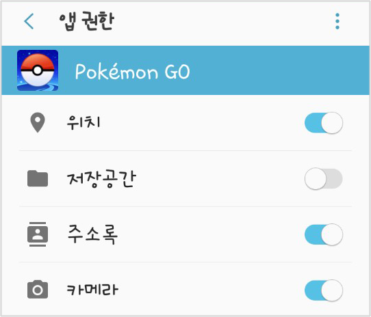 ▲ 애플리케이션 설정 중 앱권한의 저장공간을 Off로 설정해놓고, 포켓몬고를 실행하면 저장 공간 권한을 허용해달라는 요청이 팝업됩니다. 이 때 '다시 묻지 않음', '거부'를 하면 더이상 사진이 저장되지 않습니다. 만약 필요하다면 다시 앱권한으로 들어가, 저장공간을 On으로 바꾸면 됩니다.