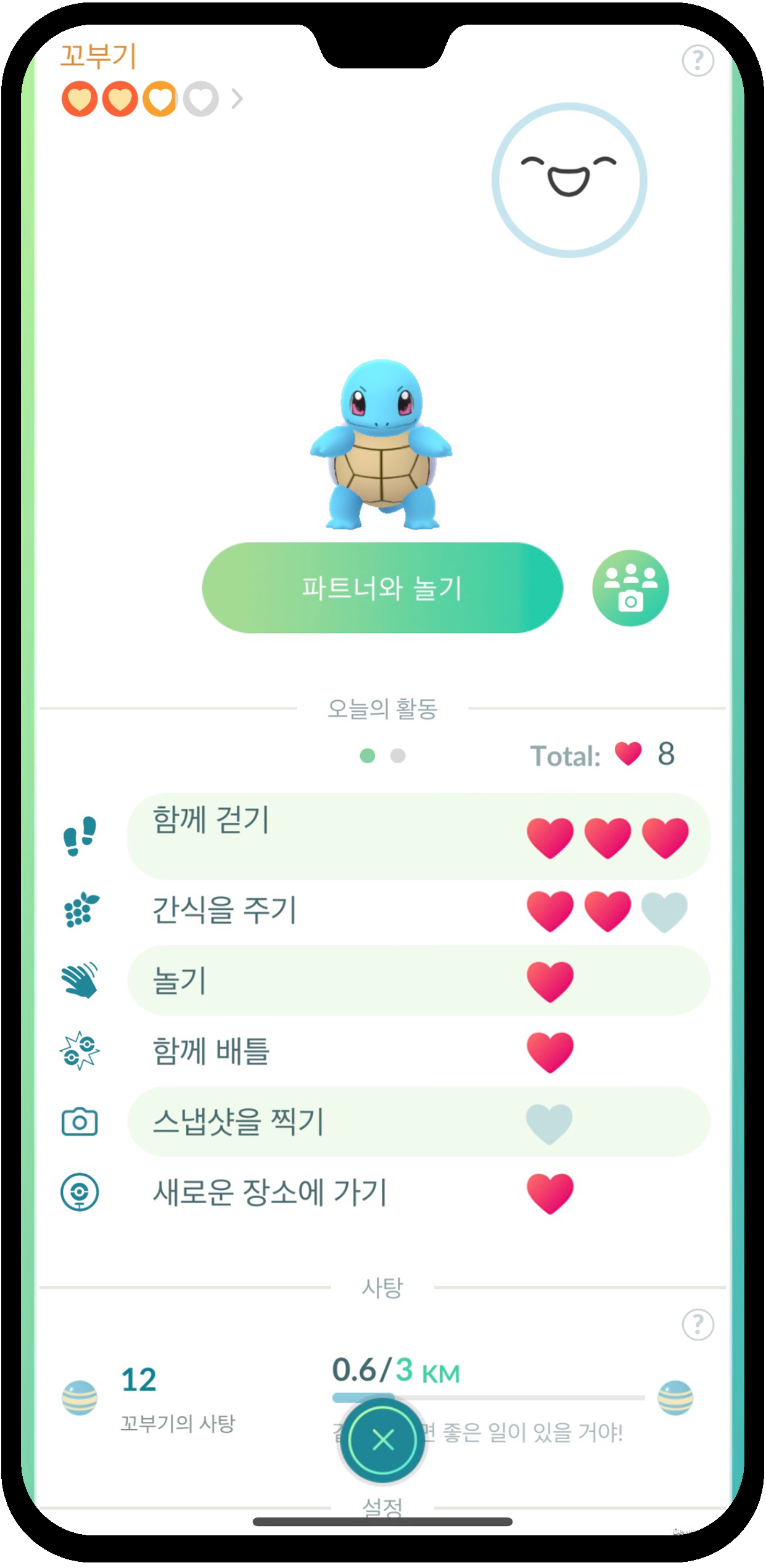 | ✓ | 파트너의 기분이 좋아지면 '사탕 필요 거리 감소, 1회 행동마다 얻는 하트 2배 등의 보너스를 받을 수 있습니다. |
